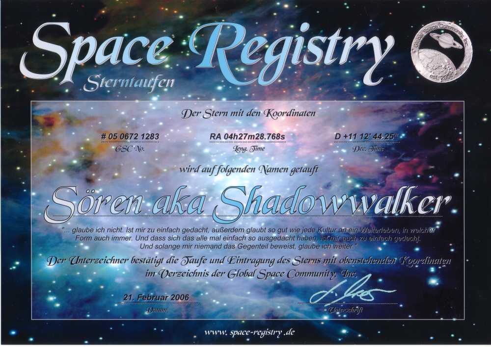 Am 21. Februar 2006 wird Sören 22 Jahre alt - der erste Geburtstag, an dem er uns ganz nahe ist und doch so schrecklich weit weg. Wir schenken ihm einen Stern - immer wenn wir den Stern am Himmel sehen werden, werden wir an Sören denken, werden uns ihm ganz nahe fühlen und unsere Wünsche in den Himmel schicken.
